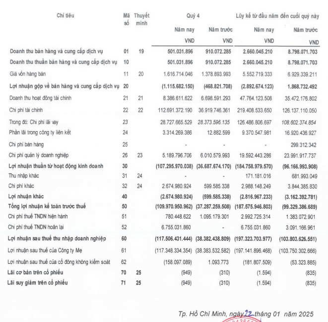CTCP DRH Holdings công bố BCTC hợp nhất quý 4/2024, cho thấy mức lỗ lũy kế 197 tỷ đồng , đánh dấu mức lỗ nặng nhất lịch sử và là năm thứ 2 liên tiếp DRH Holdings báo lỗ. Kinh doanh kém sắc, công ty cũng gặp khó khi thanh toán các khoản nợ đến hạn trong đ
