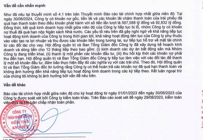 Mới đây nhất DRH Holdings đã công bố báo cáo tài chính kiểm toán bán niên 2024. Theo ý kiến của đơn vị kiểm toán, tính đến 30/6/2024 DRH Holdings có khoản nợ trái phiếu quá hạn thanh toán theo điều khoản phát hành với số tiền lần lượt là 567,588 tỷ đồng và 92,832 tỷ đồng. Đồng thời, kết quả kinh doanh hợp nhất giữa niên độ của công ty tiếp tục bị lỗ, nhóm Công ty còn có khoản nợ thuế đã quá hạn nộp Ngân sách Nhà nước.