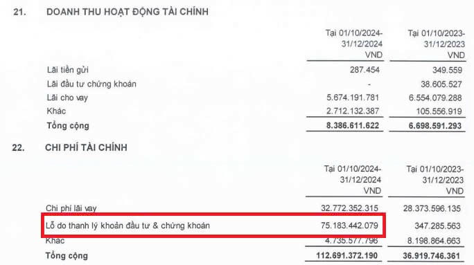 Trong năm, doanh thu về hoạt động tài chính đạt gần 48 tỷ đồng, tăng 35% so với cùng kỳ năm ngoái. Tuy nhiên, chi phí tài chính lại vượt hơn 219 tỷ đồng khiến công ty ghi nhận thêm khoản lỗ từ hoạt động tài chính, trong số đó có tới 75 tỷ đồng từ việc lỗ khi thanh lý các khoản đầu tư và chứng khoán.