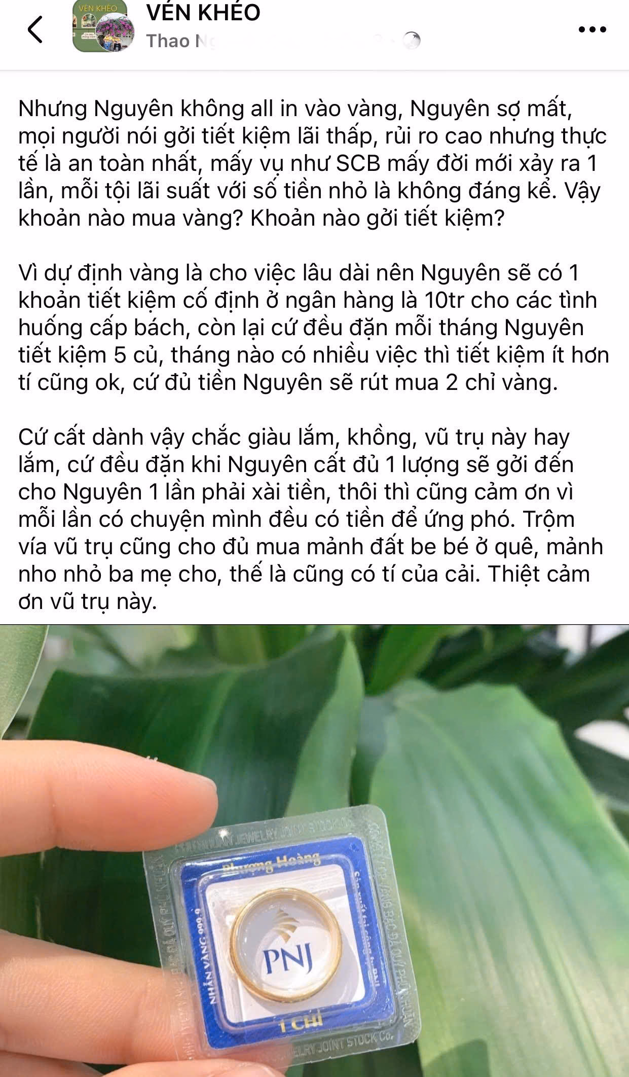 Đầu tiên, gửi tiết kiệm 10 triệu đồng để dự phòng khẩn cấp, thêm một khoản tiết kiệm gửi ngân hàng, sau đó dùng lãi từ khoản đó, cộng tiền thu nhập để dành hàng tháng dùng mua vàng, mỗi tháng hiện đang tiết kiệm được 5 triệu đồng. Đồng thời tuân thủ nguyên tắc đủ tiền mua hai chỉ vàng, là sẽ mua.