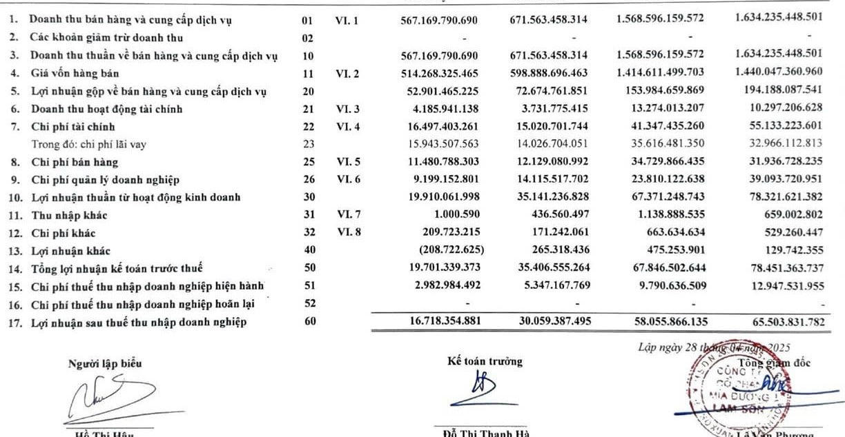 Qua báo cáo kết quả hoạt động kinh doanh Quý III, niên độ tài chính từ 01/7/2024 đến 30/6/2025, doanh thu thuần từ bán hàng và cung cấp dịch vụ của Công ty CP Mía đường Lam Sơn chỉ đạt 576,1 tỷ đồng. Trong khi cùng kỳ năm trước, con số này là hơn 671,5 tỷ đồng (giảm 15,54%). Giá vốn hàng bán năm nay đạt 514,2 tỷ đồng (giảm 14,13% so với cùng kỳ). Lợi nhuận gộp từ bán hàng và cung cấp dịch vụ cũng giảm từ 72,6 tỷ đồng xuống còn 52,9 tỷ đồng (giảm 27,21%).