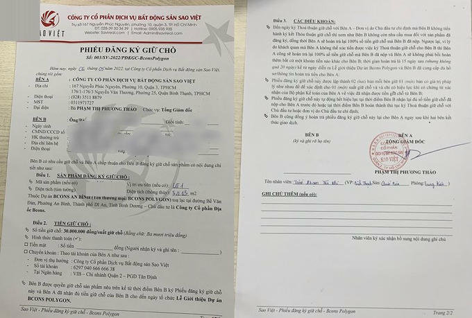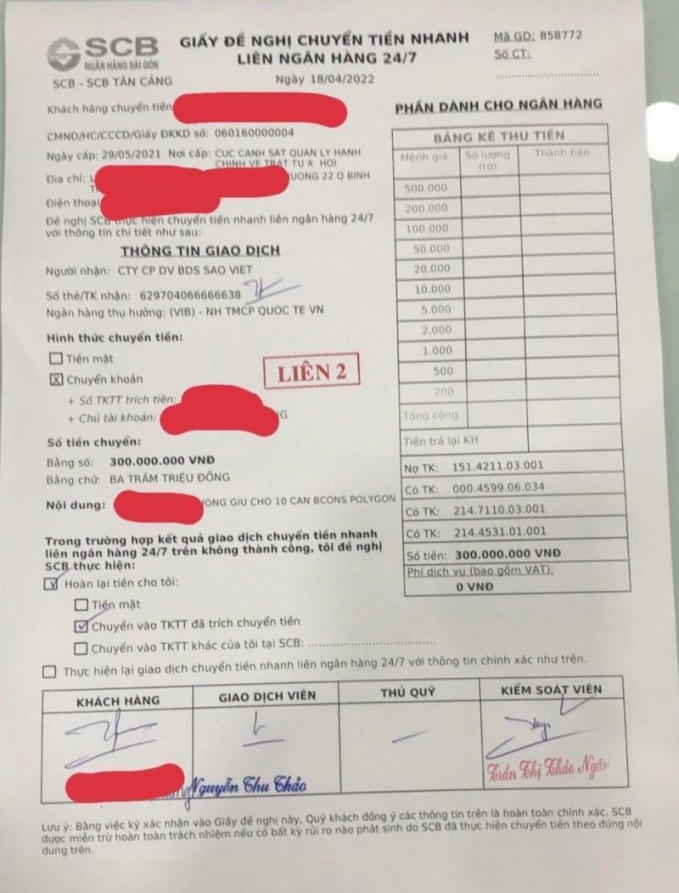 Khách hàng chuyển tiền cho Công ty Sao Việt số tiền đặt chỗ dự án Bcons Polygon