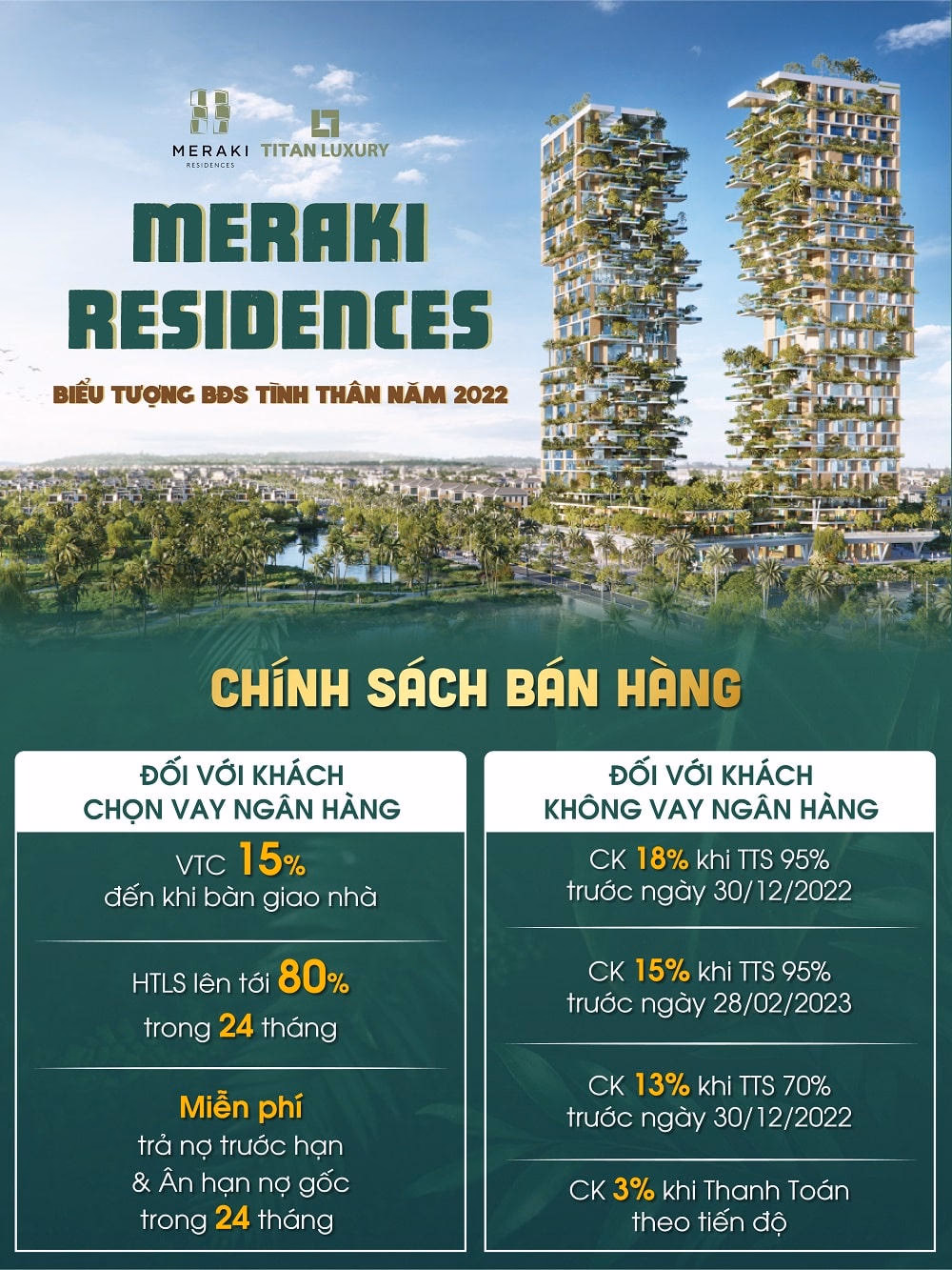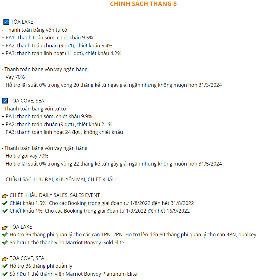 Đối với khách hàng thanh toán bằng vốn vay ngân hàng sẽ được hỗ trợ gói vay 70% và hỗ trợ lãi suất 0% trong vòng 22 tháng kể từ ngày giải ngân nhưng không muộn hơn 31/5/2024. Ngoài ra, người mua nhà còn được hỗ trợ 36 tháng phí quản lý; được sở hữu 1 thẻ thành viên Marriot Bonvoy Plantinum Elite.