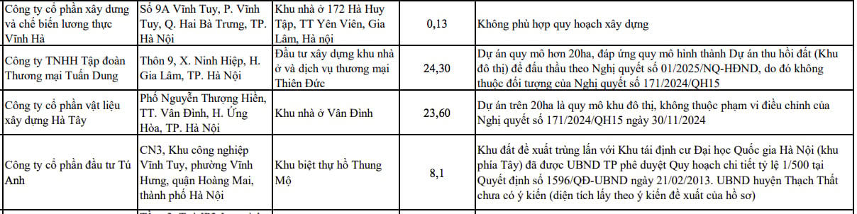 Mới đây, Sở Nông nghiệp và Môi trường (NN&MT) TP Hà Nội đã công bố danh sách các trường hợp dự án không đáp ứng điều kiện, tiêu chí đưa vào danh mục khu đất dự kiến thực hiện dự án thí điểm theo Nghị quyết số 171/2024 ngày 30/11/2024 của Quốc hội (đợt 2).