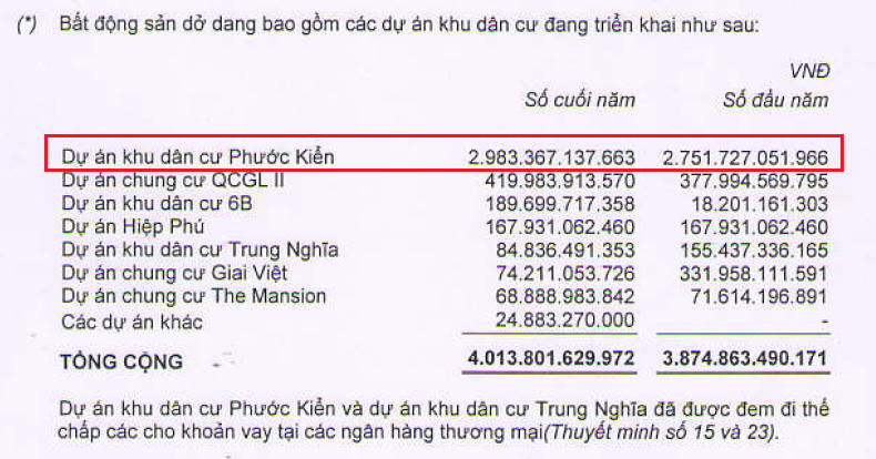 Từ năm 2009 Dự án có tên gọi đất nền Phước Kiển với giá trị dở dang là 762 tỷ đồng. Đến nay, giá trị hàng tồn kho dở dang tại dự án này đã lên đến 2.983 tỷ đồng, hiện đang được dùng thế chấp cho khoản vay ngân hàng với số dư nợ tín dụng lớn không kém tại ngân hàng Đầu tư và Phát triển Việt Nam – chi nhánh Quang Trung là 1.559 tỷ đồng.