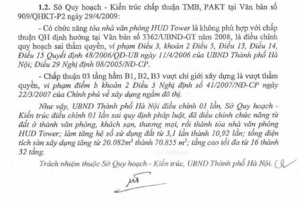 Đối với việc Chấp thuận dự án có chức năng tòa nhà văn phòng HUD Tower là không phù hợp với chấp thuận QH định hướng tại Văn bản số 3362/UBND-GT năm 2008, là điều chỉnh quy hoạch sai thẩm quyền, vi phạm Điều 3, khoản 2 Điều 5, Điều 13, Điều 14, Điều 15 Quyết định 48/2006/QĐ-UB ngày 11/04/2006 của UBND thành phố Hà Nội; Điều 29 Nghị định 08/2005/NĐ-CP.