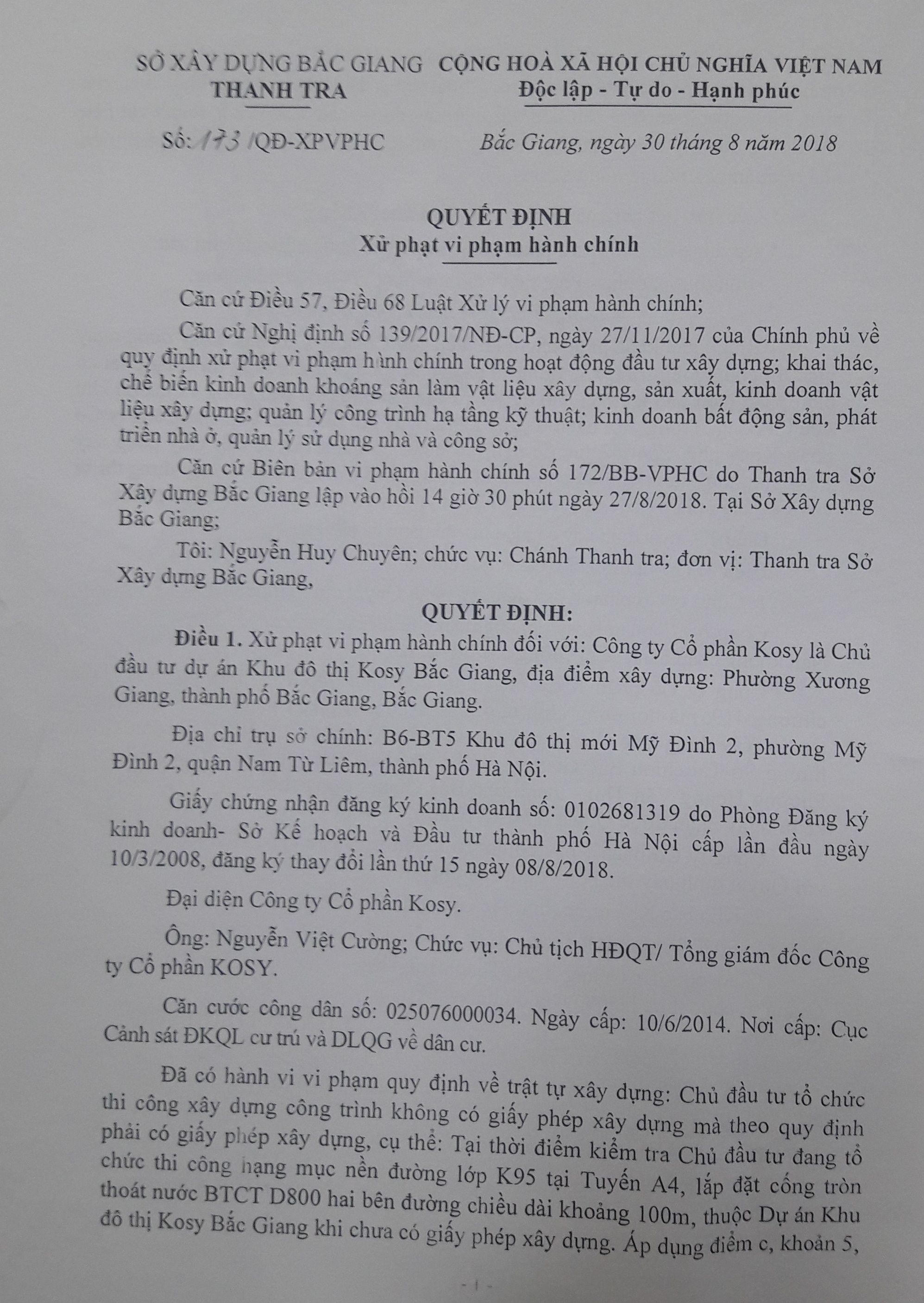 Theo hồ sơ, Công ty Cổ phần Kosy - CĐT Dự án Khu đô thị Kosy Bắc Giang trước đó đã từng bị xử phạt vi phạm hành chính trong lĩnh vực xây dựng. Theo Quyết định Xử phạt vi phạm hành chính số 173/QĐ-XPVPHC ngày 30/8/2018, công ty này bị xử phạt về hành vi tổ chức thi công xây dựng công trình không có giấy phép xây dựng mà theo quy định phải có giấy phép xây dựng. Mức xử phạt 40 triệu đồng.