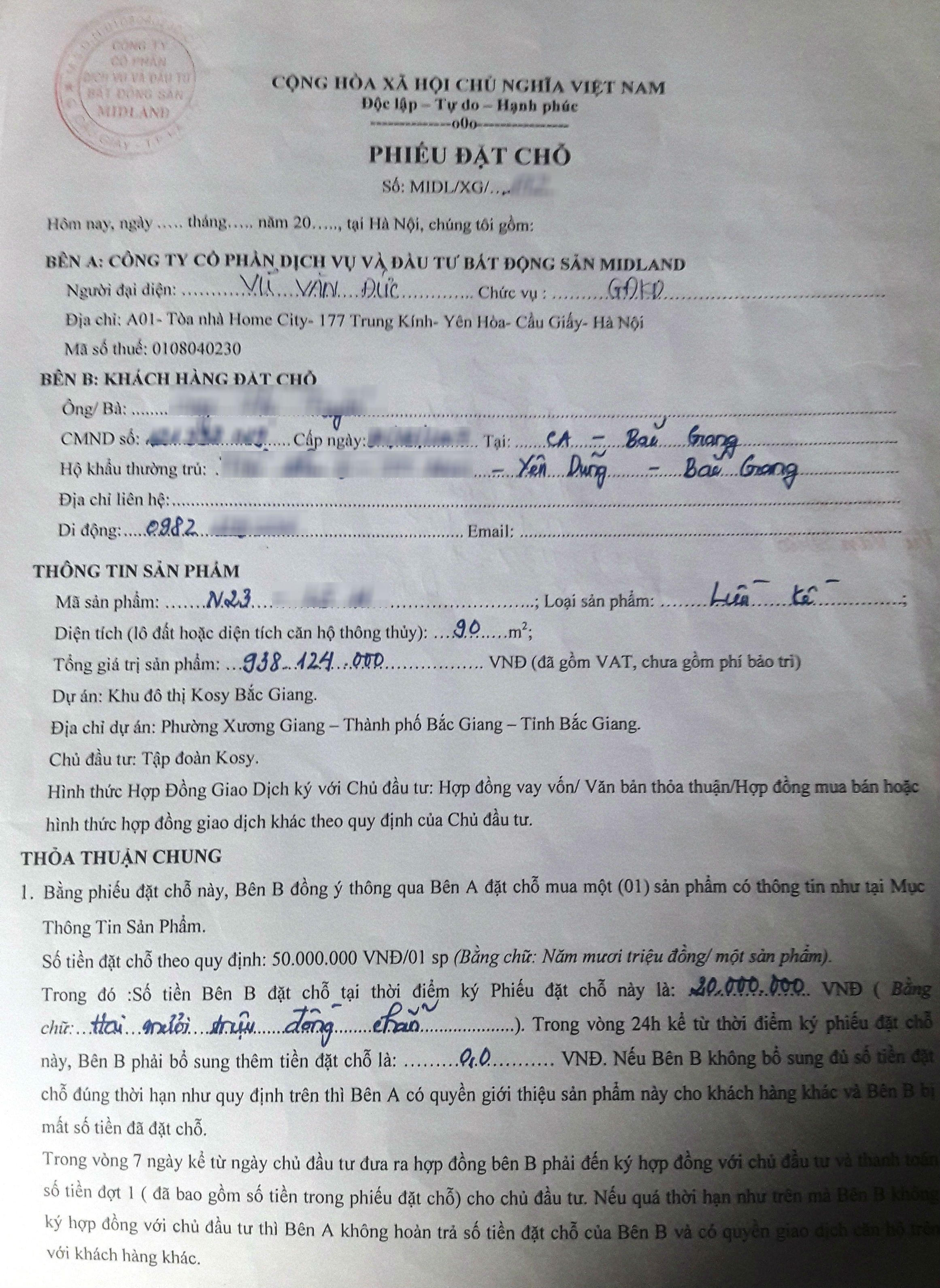 Mặc dù Chủ tịch UBND tỉnh Bắc Giang đã có chỉ đạo, thế nhưng sàn bất động sản Midland vẫn rao bán, nhận đặt chỗ và thu tiền của khách hàng tại Dự án Khu đô thị Kosy Bắc Giang. (Ảnh: Trần Tiền)