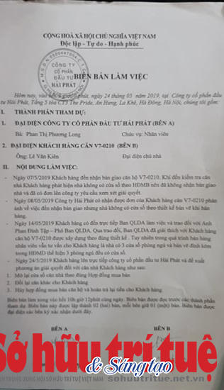 Cụ thể, trong đơn cầu cứu gửi tới Sở Hữu Trí Tuệ online, chị Lê Khánh Huyền (trú tại xóm 1 Vân Đình, thị trấn Vân Đình, Ứng Hoà, Hà Nội) cho biết chị có mua căn hộ thuộc diện nhà ở xã hội, tên dự án The Vesta do Công ty Cổ phần đầu tư Hải Phát (viết tắt Hải Phát) là chủ đầu tư, số hợp đồng mua bán PLV7-0210/HĐMB được ký ngày 10/01/2019. Số căn hộ là V7-0210, diện tích là 68.30 m, địa chỉ tại dự án The Vesta Phú Lãm, Hà Đông, Hà Nội.
