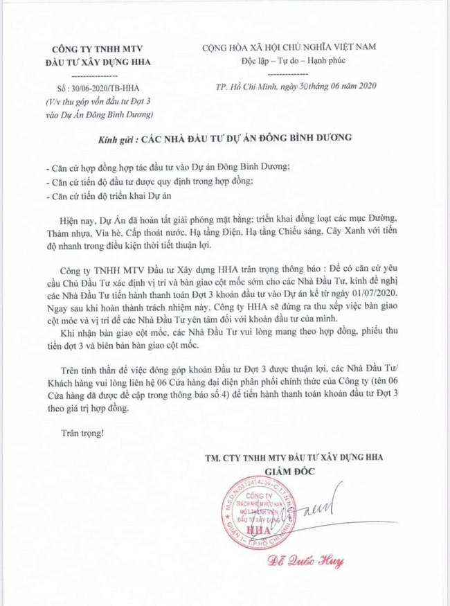Mới đây, vào ngày 30/6/2020, Công ty TNHH MTV Đầu tư và Xây dựng HHA đã gửi thông báo tới khách hàng về việc thu góp vốn đầu tư đợt 3 vào dự án Đông Bình Dương và dự kiến bàn giao mốc, vị trí đất cho khách hàng.
