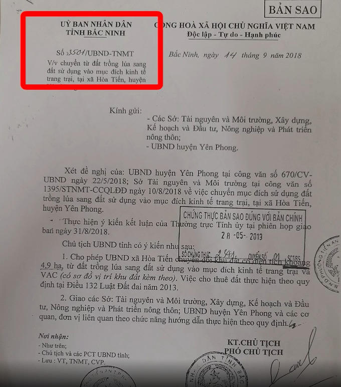Theo tìm hiểu PV Chất lượng và cuộc sống, ngày 14/9/2018, UBND tỉnh Bắc Ninh ban hành văn bản 3501/UBND-TNMT về việc chuyển từ đất trồng lúa sang đất sử dụng vào mục đích kinh tế trang trại, tại xã Hòa Tiến, huyện Yên Phong.