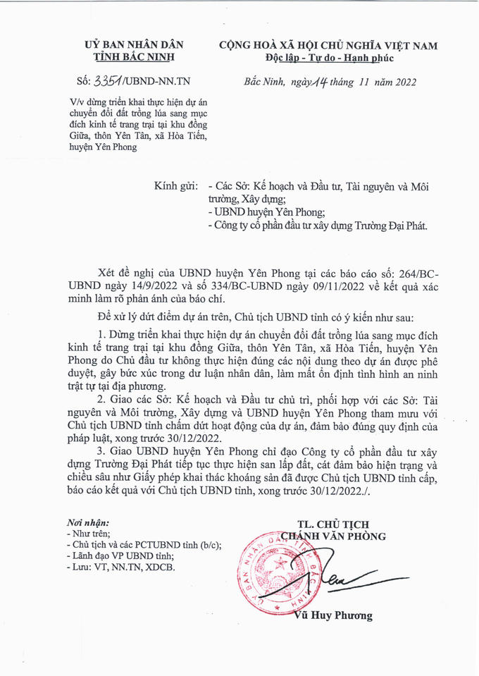Thứ ba, giao UBND huyện Yên Phong chỉ đạo Công ty cổ phần đầu tư xây dựng Trường Đại Phát tiếp tục thực hiện san lấp đất, cát đảm bảo hiện trạng và chiều sâu như Giấy phép khai thác khoáng sản đã được Chủ tịch UBND tỉnh cấp, báo cáo kết quả với Chủ tịch UBND tỉnh, xong trước 30.12.2022.
