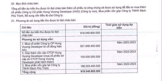 Trong đó, HTP sẽ dùng 196,2 tỉ đồng để mua phần vốn góp tại Bách Phú Thịnh; 721,8 tỉ đồng để mua cổ phần Hưng Vượng Developer từ cổ đông hiện hữu và mua cổ phiếu sơ cấp do công ty này phát hành thêm.