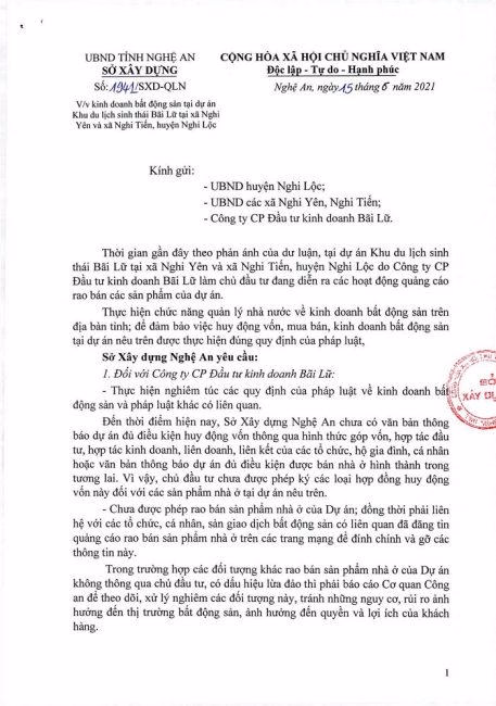 Đồng thời, Sở này yêu cầu UBND huyện Nghi Lộc chỉ đạo các phòng, ban chức năng và UBND các xã Nghi Yên, Nghi tiến tổ chức tuyên truyền, phổ biến, đăng tải thông tin quy định của pháp luật về kinh doanh BĐS, điều kiện huy động vốn của dự án để người dân trên đại bàn được biết, đồng thời khuyến cáo người dân phải tìm hiểu kỹ thông tin, hồ sơ pháp lý dự án khi có ý định tham gia giao dịch, kinh doanh BĐS để tránh các thiệt hại có thể xảy ra. Cùng với đó, thường xuyên theo dõi, nắm bắt, cập nhật thông tin, tình hình diễn biến kinh doanh BĐS tại dự án nêu trên để có các biện pháp xử lý nghiêm, kịp thời nhằm tránh những nguy cơ, rủi ro ảnh hưởng đến thị trường BĐS.
