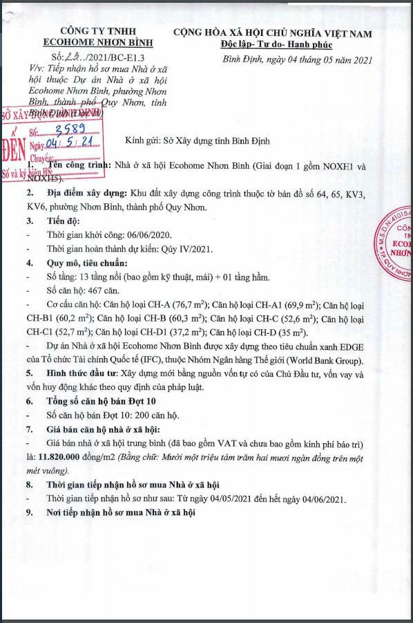 Đáng chú ý, đây là lần thứ 10 Sở Xây dựng Bình Định công bố tiếp nhận hồ sơ mua nhà xã hội dự án Ecohome Nhơn Bình. Trước đó, ngày 8/4, Sở Xây dựng Bình Định cũng đã công bố tiếp nhận hồ sơ mua nhà ở xã hội dự án này lần thứ 9. Ngày 4/3 là lần công bố thứ 8 với số căn hộ được bán là 200 căn hộ....