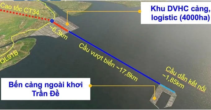 Công ty CP Tư vấn xây dựng công trình hàng hải cho biết, cảng Trần Đề có tổng diện tích hơn 4.435ha, khu hậu cần logistics có diện tích 4.000 ha, khu bến cảng ngoài khơi 435ha. Cảng có cầu cảng vượt biển dài 17,8km, hệ thống đê kè chắn sóng dài 9.800m…