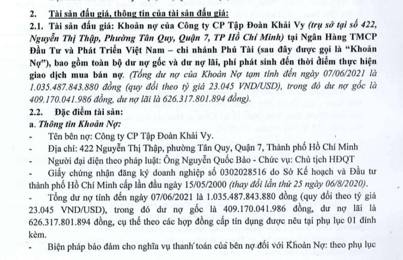 Liên quan đến Tập đoàn Khải Vy, ngày 28/6 vừa qua, Ngân hàng TMCP Đầu tư và Phát triển Việt Nam (BIDV) – Chi nhánh Phú Tài vừa thông báo bán đấu giá khoản nợ của Khải Vy, có tài sản bảo đảm là nhiều bất động sản. Tính đến thời điểm ngày 7/6/2021, tổng dư nợ của Tập đoàn Khải Vy tại BIDV là hơn 1.035 tỷ đồng, trong đó dư nợ gốc là 409 tỷ đồng và dư nợ lãi là 626 tỷ đồng.