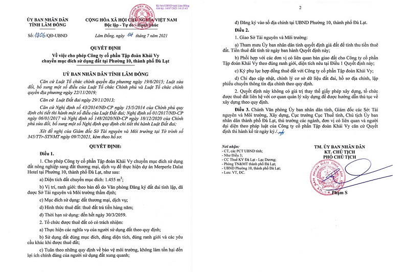 Mới đây, UBND tỉnh Lâm Đồng đã có văn bản cho phép CTCP Tập đoàn Khải Vy chuyển mục đích sử dụng đất nông nghiệp sang đất thương mại, dịch vụ để xây dựng Dự án Merperle Dalat Hotel.