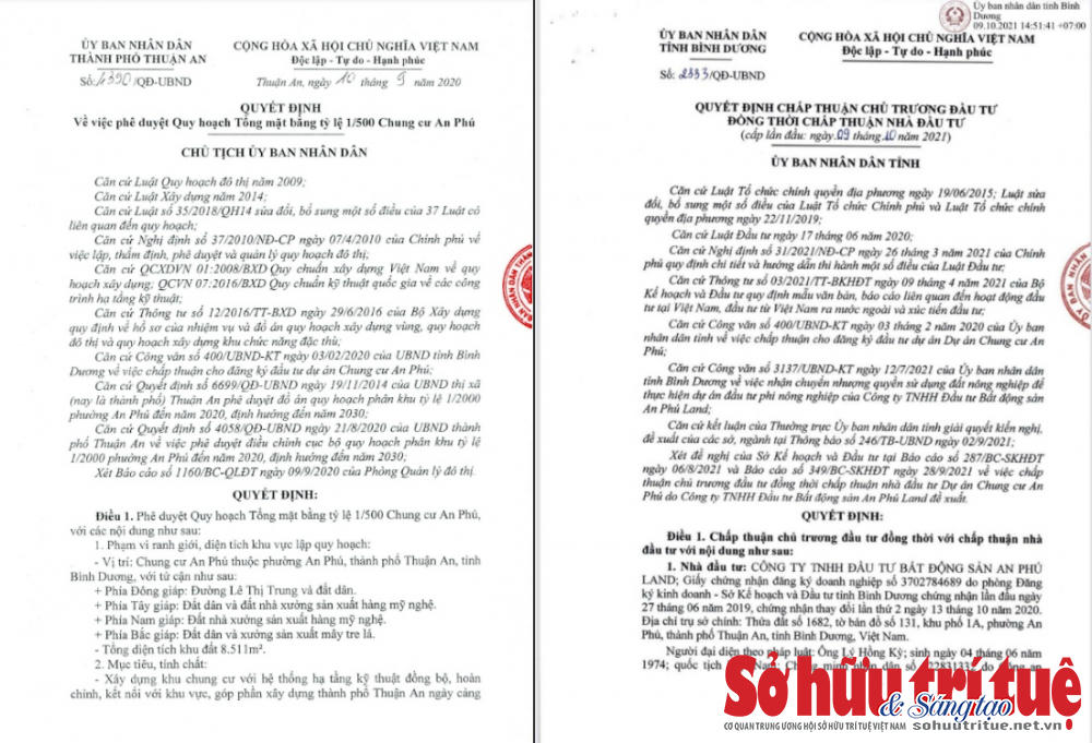 Cụ thể, ngày 10/09/2020, dự án được UBND TP Thuận An phê duyệt Quy hoặc Tổng mặt bằng tỷ lệ 1/500 tại Quyết định số 4390/QĐ-UBND. Đến ngày 09/10/2021, UBND tỉnh Bình dương mới có văn bản số 2333/QĐ-UBND về Quyết định chấp thuận chủ trương đầu tư đồng thời chấp thuận nhà đầu tư cho Công ty TNHH Đầu tư Bất động sản An Phú Land.