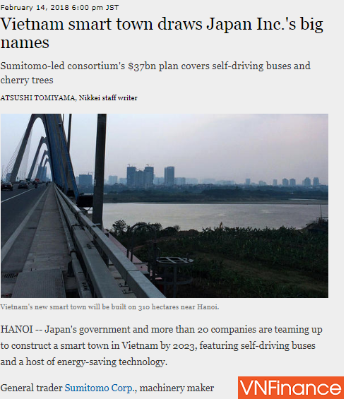 Tờ báo này khẳng định, việc đầu tư Dự án “Thành phố thông minh – Smart Town” ở phía Bắc Hà Nội là phù hợp với Chính phủ Nhật Bản và Thủ tướng Shinzo Abe về việc thúc đẩy "đầu tư cơ sở hạ tầng chất lượng cao" ở các nước đang phát triển.