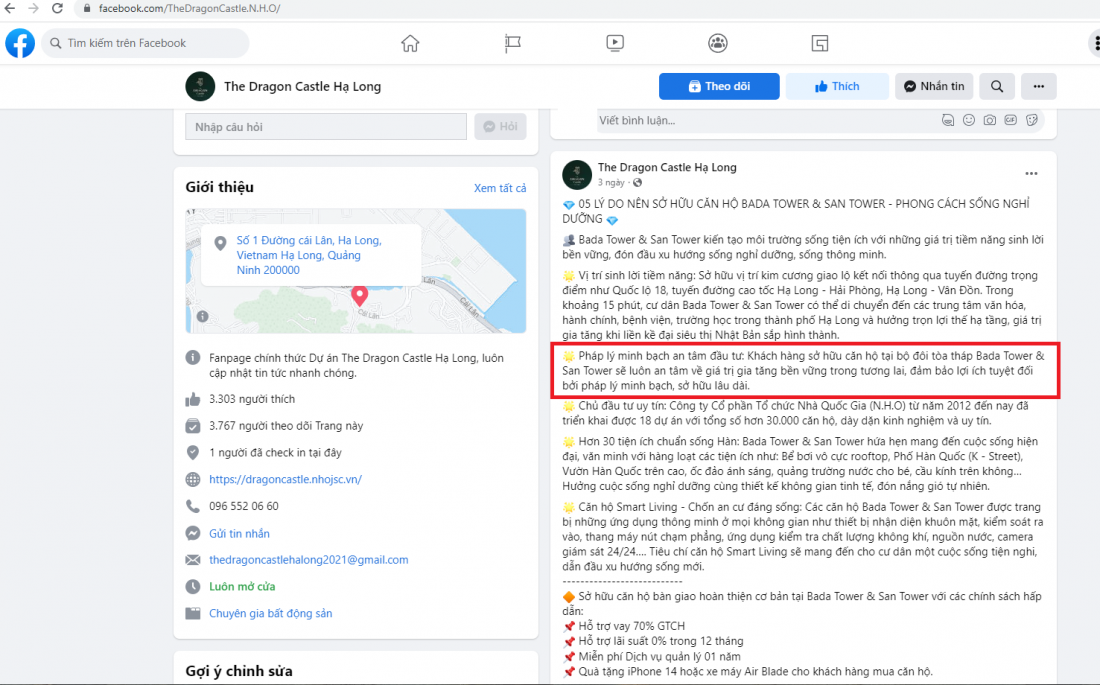 Theo tìm hiểu của phóng viên, dự án đang được mở bán rầm rộ, giới thiệu về các tiện ích nổi bật cùng các chính sách mua nhà. Đáng lưu ý, tại bộ đôi tòa chung cư Bada Tower và San Tower thược dự án The Dragon Castle Hạ Long được quảng cáo với lời mật ngọt như: "Khách hàng sở hữu căn hộ tại bộ đôi tòa tháp Bada Tower & San Tower sẽ luôn an tâm về giá trị gia tăng bền vững trong tương lai, đảm bảo lợi ích tuyệt đối bởi pháp lý minh bạch, sở hữu lâu dài". Vấn đề về pháp lý rất đáng lưu ý khi khách hàng đầu tư vào dự án này.