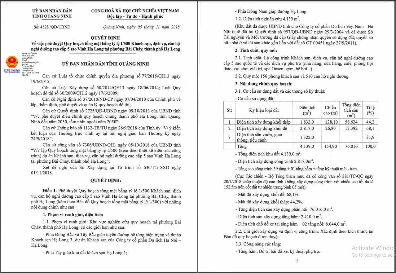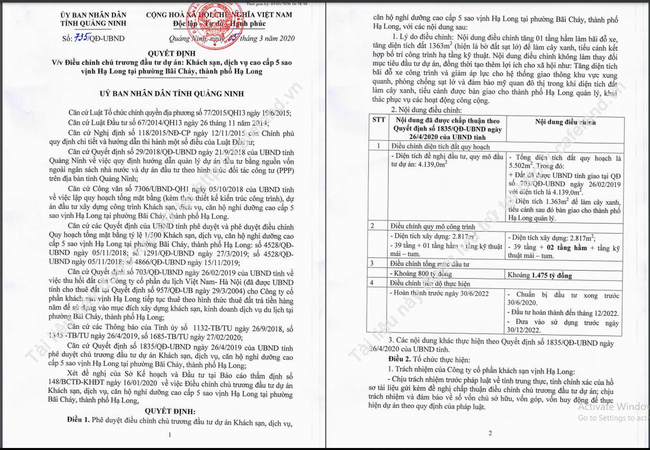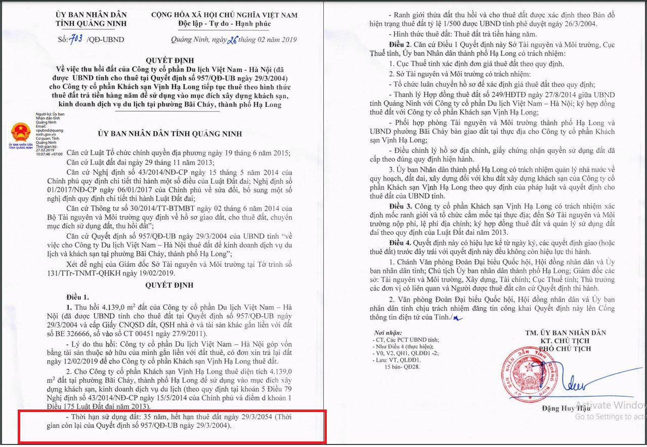 Được biết, khu đất này được UBND tỉnh Hạ Long cho VTH thuê đất từ năm 2004 tại Quyết định số 957/QĐ-UB, trong đó cho biết thời hạn hoạt động của dự án là 50 năm.