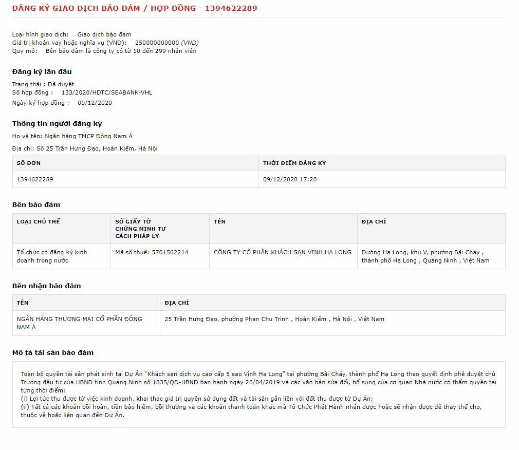 Trước đó, vào cuối năm 2020, CTCP Khách sạn Vịnh Hạ Long cũng đã thế chấp toàn bộ quyền tài sản phát sinh tại dự án The Holiday Hạ Long tại SeABank cho khoản vay 250 tỷ đồng.