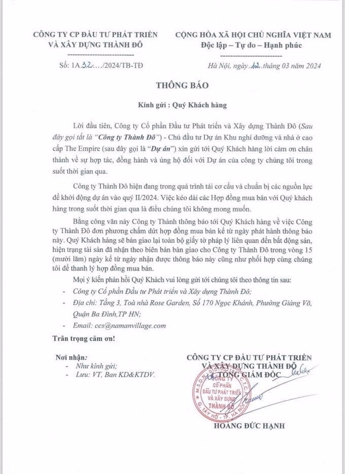 Theo đó, doanh nghiệp này cho biết công ty đang trong quá trình tái cơ cấu và chuẩn bị các nguồn lực để khởi động dự án The Empire vào quý II/2024, việc kéo dài các Hợp đồng mua bán với khách hàng trong thời gian qua là điều không mong muốn. Vì vậy, công ty đơn phương chấm dứt hợp đồng mua bán kể từ ngày phát hành thông báo.