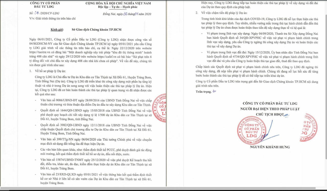 Ở một diễn biến khác, năm 2020 giải trình về những sai phạm tại dự án Tân Thịnh với Sở giao dịch chứng khoán Tp.HCM, việc chậm tiến độ là do vướng mắc trong thủ tục hành chính làm thủ tục pháp lý dự án chưa được hoàn thiện theo tiến độ xây dựng, dẫn đến những vi phạm trong lĩnh vực xây dựng và đất đai của LDG như đã nêu trên. LDG cũng thông tin, hiện đơn vị này đã chấp hành các quyết định xử phạt vi phạm hành chính nêu trên, Công ty đã ngừng thi công xây dựng và nộp tiền phạt vi phạm hành chính.