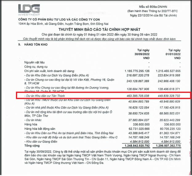 Theo báo cáo tài chính Quý 3/2022, tại dự án Tân Thịnh công ty này đang có con số tồn kho là 463 tỷ đồng. Tình hình hoạt động kinh doanh của LDG trong 9 tháng năm 2022 cũng khá bết bát, với doanh thu và lợi nhuận ròng giảm lần lượt 42% và 55% so với cùng kỳ còn 146 tỷ đồng và 20 tỷ đồng. Theo đó, công ty mới hoàn thành được 6,4% chỉ tiêu lãi ròng cả năm. Tính đến cuối quý 3, tổng tài sản của LDG ghi nhận gần 7.842 tỷ, trong đó gần 70% là các khoản phải thu (hơn 5.467 tỷ đồng); tiền và tương đương tiền giảm tới 81% còn 14 tỷ đồng; nợ phải trả tăng gần 20% lên mức 4.533 tỷ, trong đó phải trả khác là 2.144 tỷ đồng (tăng 60%), tương đương 47% cơ cấu nợ; nợ vay tài chính ở mức 1.329 tỷ đồng.