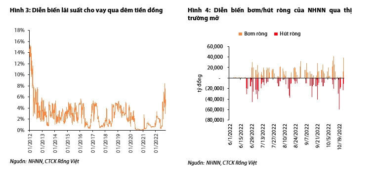 Trên thị trường liên ngân hàng, lãi suất cho vay qua đêm sau giai đoạn tăng rất mạnh lên đỉnh điểm là 8,4% vào đầu tháng 10 đã giảm trở lại còn 5,5% tại ngày 24/10/2022, cao hơn 53 điểm cơ bản so với cuối tháng 9.