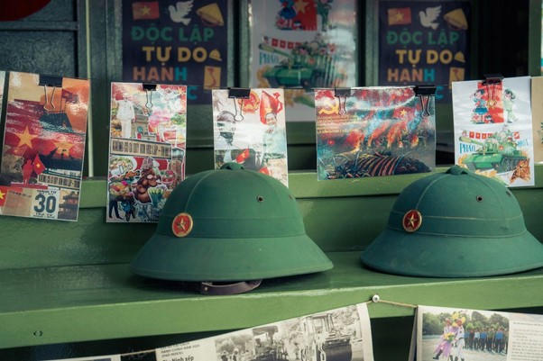 Rất nhiều vật dụng “cũ kỹ” được sắp đặt ngẫu hứng tại khu ẩm thực như bàn ghế gỗ thô mộc, xe hàng rong, chậu cây, ấm tích, mũ lính, bản đồ Việt Nam hay chiếc ly nước phủ bọt màu quốc kỳ…“Không gian này khiến tôi hoài niệm về khu chợ phố ngày xưa, bồi hồi nhớ về thời bao cấp, gian khó nhưng ấm áp tình người” – Bà Nguyễn Thị Nụ (Long An) chia sẻ.