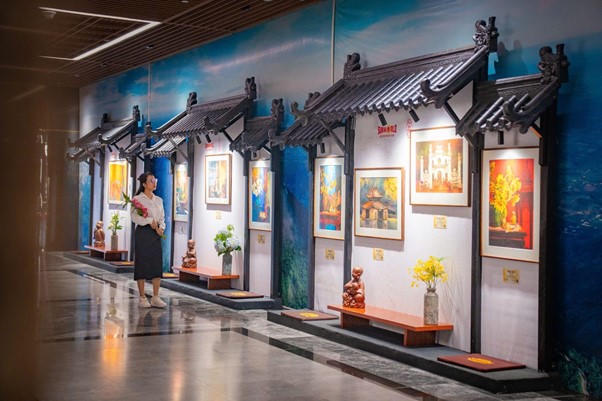 Tại hành lang dẫn đến khu Tôn tượng Di Lặc Bồ Tát, triển lãm tranh “Về Ngộ” với 45 bức tranh mang chủ đề đền chùa của hoạ sĩ Hoàng Phong là nên một không gian check-in mới đậm sắc màu thiền định. Tại đây, người yêu nghệ thuật có thể gặp lại những ngôi đền, những mái chùa rất quen thuộc trên khắp cả nước như chùa Bà (núi Bà Đen), chùa Dâu (Bắc Ninh), chùa Đồng (Yên Tử), chùa Keo (Thái Bình), chùa Hương (Hà Nội), Chùa Bút Tháp (Bắc Ninh), đền Bà Kiệu, Phủ Tây Hồ (Hà Nội)...