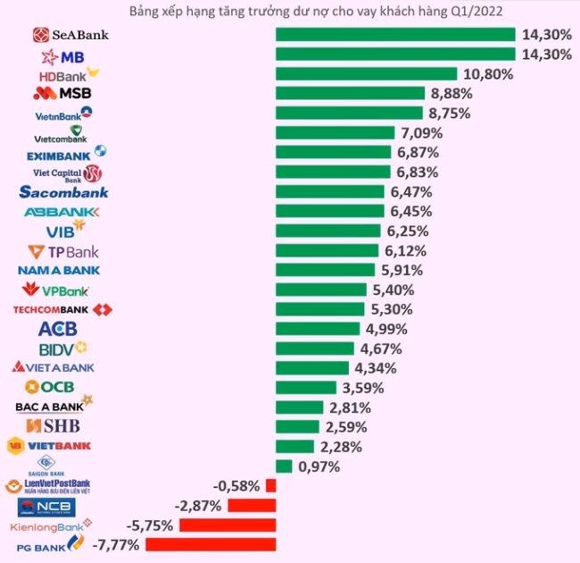 Bảng xếp hạng tăng trưởng dư nợ cho vay khách hàng Q1/2022.