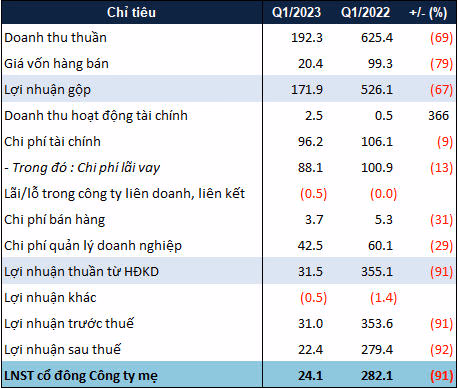 Cụ thể, quý I, doanh thu thuần và lãi ròng của PDR chỉ đạt lần lượt 192 tỷ đồng và 24 tỷ đồng. Trong kỳ, công ty đã chủ động tiết giảm các chi phí như chi phí tài chính (giảm 9%), chi phí bán hàng (giảm 31%) và chi phí quản lý (giảm 29).