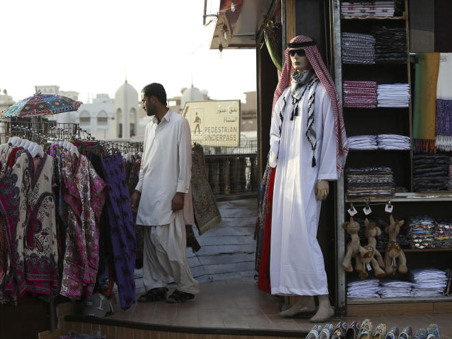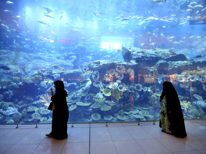 Những người phụ nữ quàng khăn đội đầu đi qua bể thủy sinh khổng lồ nằm trong trung tâm mua sắm Dubai Mall. Không chỉ là nơi mua sắm, trung tâm thương mại này còn cung cấp dịch vụ bơi với cá mập và trượt bang trong nhà.
