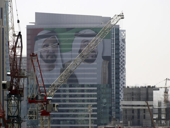 Pano lớn in hình Sheikh Mohammed, người đứng đầu Dubai và Sheikh Khalifa, Tổng thống Các Tiểu Vương quốc Ảrập thống nhất (UAE). Dubai là một trong bảy tiểu vương quốc trực thuộc UAE và là một trong hai tiểu vương quốc giàu có nhất, bên cạnh Abu Dhabi.