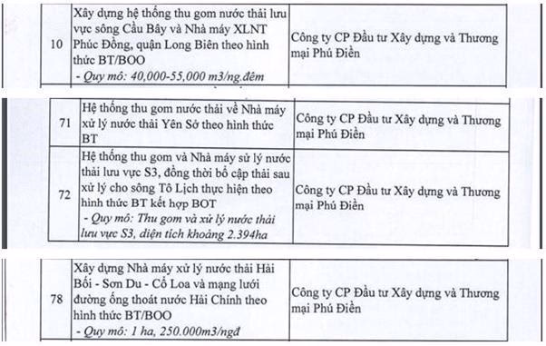Trong danh sách 82 dự án dừng triển khai, công ty CP Đầu tư Xây dựng và Thương mại Phú Điền có 4 dự án bao gồm: Xây dựng hệ thống thu gom nước thải lưu vực sông Cầu Bây và nhà máy XLNT Phúc Đồng, quận Long Biên; hệ thống thu gom nước thải về nhà máy xử lý nước thải Yên Sở; hệ thống thu gom và Nhà máy xử lý nước thải lưu vực S3, đồng thời bổ cập thải sau xử lý cho sông Tô Lịch; xây dựng nhà máy xử lý nước thải Hải Bối – Sơn Du- Cổ Loa và mạng lưới đường ống thoát nước Hải Chính.