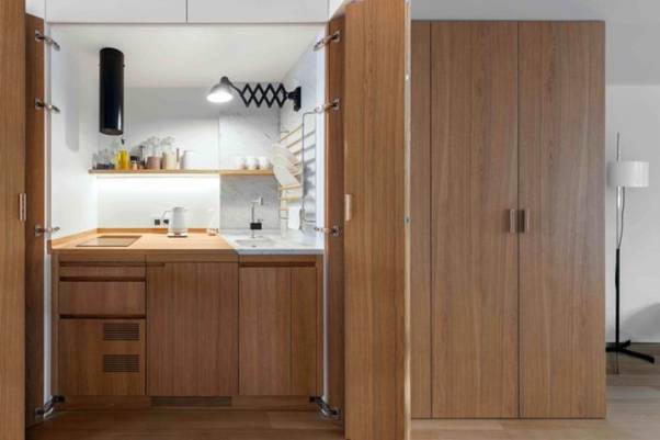 Đây là phòng bếp của một căn hộ rộng 33m2 ở Moscow, Nga, được thiết kế bởi Studio Bazi. Khi muốn che đi căn bếp này, chủ nhà chỉ cần kéo cửa xếp lại và nó sẽ giống với một chiếc tủ quần áo khi nhìn từ bên ngoài.