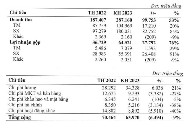Chi phí Marketing và bản hàng giảm 27%, tương ứng mức giảm 3,4 tỷ đồng, chủ yếu giảm trong chi phí phân bố của các khoản đầu tư về bảng hiệu quảng cáo, showrom trưng bày và các khoản Marketing khác đã phân bổ hết trong năm 2022;