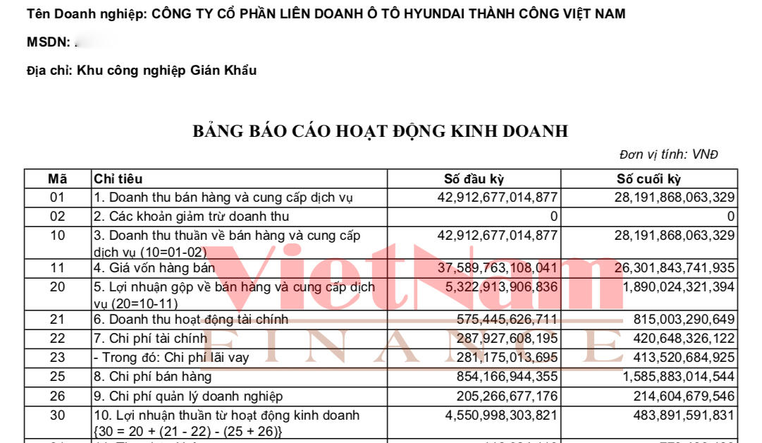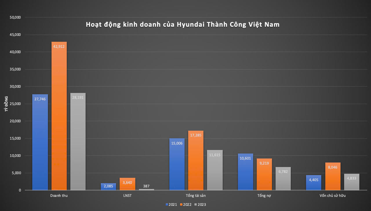 Tuy nhiên, bước sang năm 2023 doanh thu của Hyundai Thành Công Việt Nam bất ngờ quay đầu giảm mạnh về mức hơn 28.191,86 tỷ đồng, giảm khoảng 14.720,80 tỷ đồng, tương đương giảm 34% so với năm trước đó.