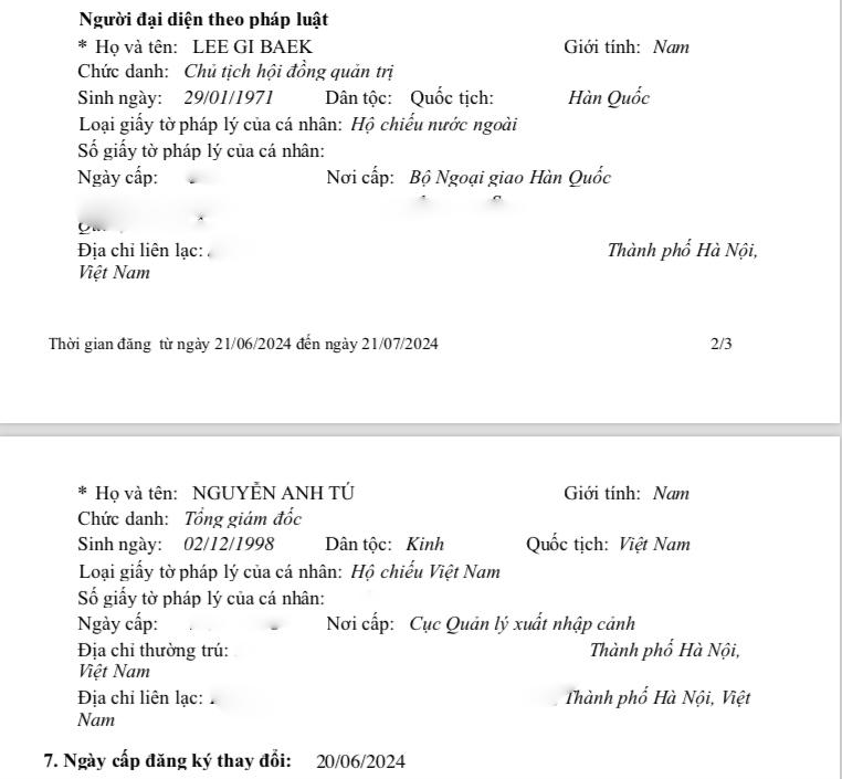 Tháng 6/2024, Chủ tịch HĐQT của doanh nghiệp này tiếp tục có sự thay đổi khi ông Lee Gi Baek (sinh năm 1971, quốc tịch Hàn Quốc) thay ông Oh In Won giữ chức Chủ tịch HĐQT công ty, kiêm người đại diện theo pháp luật. Trong khi đó, ông Nguyễn Anh Tú tiếp tục giữ chức vụ Tổng Giám đốc.