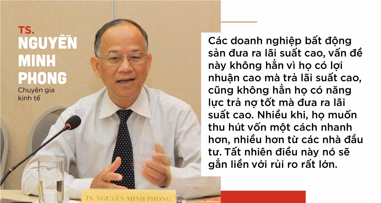 TS. Nguyễn Minh Phong: Thực tế, trên thị trường xuất hiện những doanh nghiệp tài chính yếu kém nhưng vẫn phát hành khá nhiều trái phiếu với lãi suất cao. Đây là hình thức lừa đảo. Vì về nguyên tắc, doanh nghiệp chỉ được phát hành trái phiếu trong điều kiện được cơ quan chủ quản cho phép. Họ phải có vốn lành mạnh, không nợ, minh bạch. Còn họ cứ lập lờ thông tin này thì giống như hình thức lừa đảo, càng làm mất uy tín của trái phiếu bất động sản. Chưa kể, tình trạng này còn gây mất lòng tin vào thị trường này.
