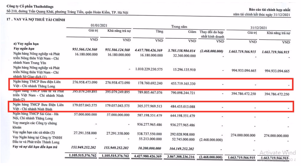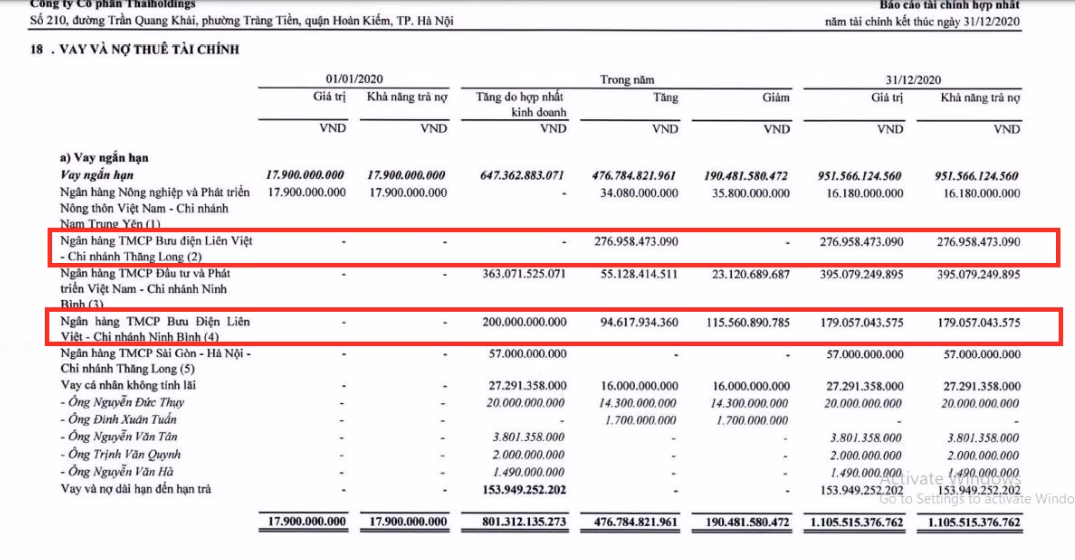 Ngoài ra, tính đến 31/12/2020, LienVietPostBank - CN Ninh Bình cũng cho Thaiholdings vay ngắn hạn hơn 179 tỷ đồng. Các khoản vay được thực hiện theo Hợp đồng tín dụng có hạn mức cho vay 200 tỷ đồng. Mục đích vay là để bổ sung vốn lưu động phục vụ hoạt động kinh doanh thương mại nguyên, vật liệu xây dựng.