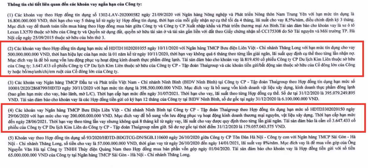 Thời hạn cấp hạn mức đến ngày 28/6/2021. Tài sản đảm bảo là cầm cố hơn 3,6 triệu cổ phiếu của CTCP Du lịch Kim Liên do CTCP - Tập đoàn Thaigroup nắm giữ. Số dư nợ gốc tại thời điểm 31/12/2021 là hơn 179 tỷ đồng.
