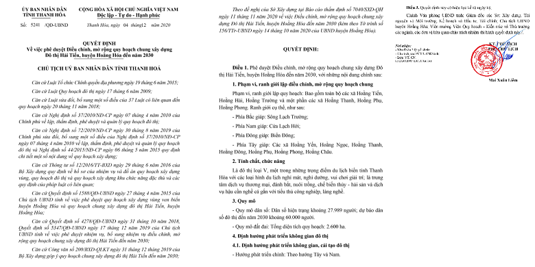 Mới đây UBND tỉnh Thanh Hóa đã ban hành Quyết định số 5241/QĐ-UBND ngày 4-12-2020 phê duyệt điều chỉnh, mở rộng quy hoạch chung xây dựng Đô thị Hải Tiến. Theo quyết định, phạm vi, ranh giới lập quy hoạch bao gồm toàn bộ các xã Hoằng Tiến, Hoằng Hải, Hoằng Trường và một phần các xã Hoằng Thanh, Hoằng Phụ, Hoằng Phong. Tổng diện tích quy hoạch là 2.600 ha, quy mô dân số hiện tại khoảng 27.989 người, dự báo dân số đến năm 2030 khoảng 60.000 người.