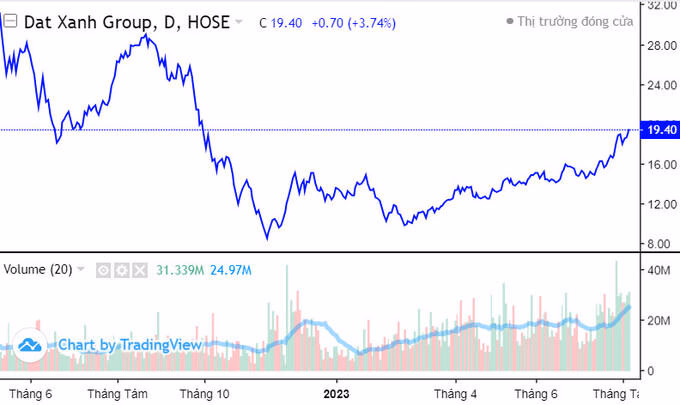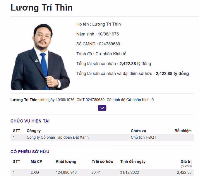 Cũng làm lĩnh vực bất động sản, ông Lương Trí Thìn, Chủ tịch HĐQT Tập đoàn Đất Xanh đang nắm trong tay gần 125 triệu cổ phiếu DXG. Cổ phiếu DXG đã tăng 52% từ đầu năm 2023 đến nay, làm gia tăng đáng kể, gấp rưỡi lần khối tài sản của ông Lương Trí Thìn.