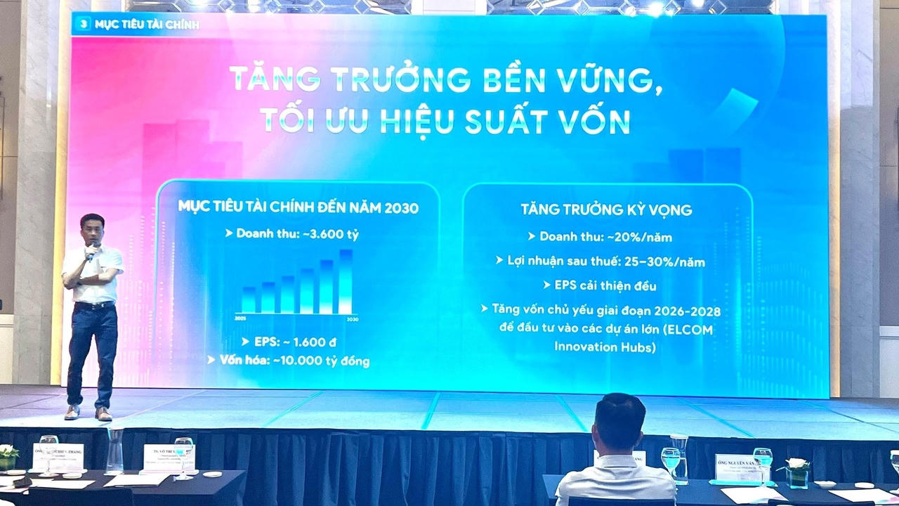 Về kế hoạch kinh doanh, Chủ tịch ELCOM cho biết doanh nghiệp đặt mục tiêu giai đoạn 2025-2030 doanh thu tăng trưởng 20% mỗi năm, lợi nhuận sau thuế tăng trưởng 25-30% mỗi năm.