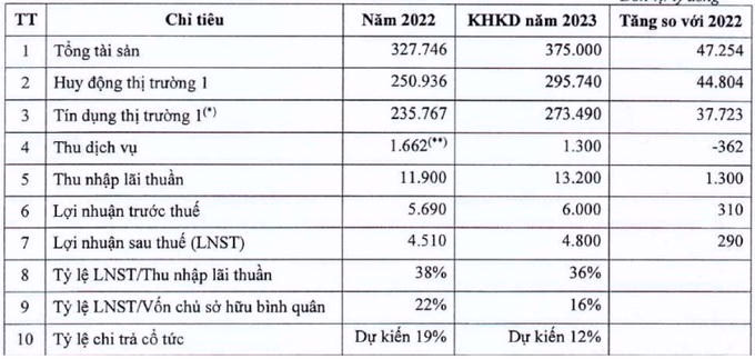 Thu nhập lãi thuần tăng 10,9%, đạt 13.200 tỷ đồng nhưng thu dịch vụ giảm 21,8% (do năm 2022 có khoản thu phí hỗ trợ ban đầu ký kết hợp đồng độc quyền bảo hiểm với Dai-ichi) còn 1.300 tỷ đồng nên kế hoạch lợi nhuận trước thuế chỉ tăng nhẹ 5,4%, đạt 6.000 tỷ đồng. Tỷ lệ chi trả cổ tức dự kiến 12%.