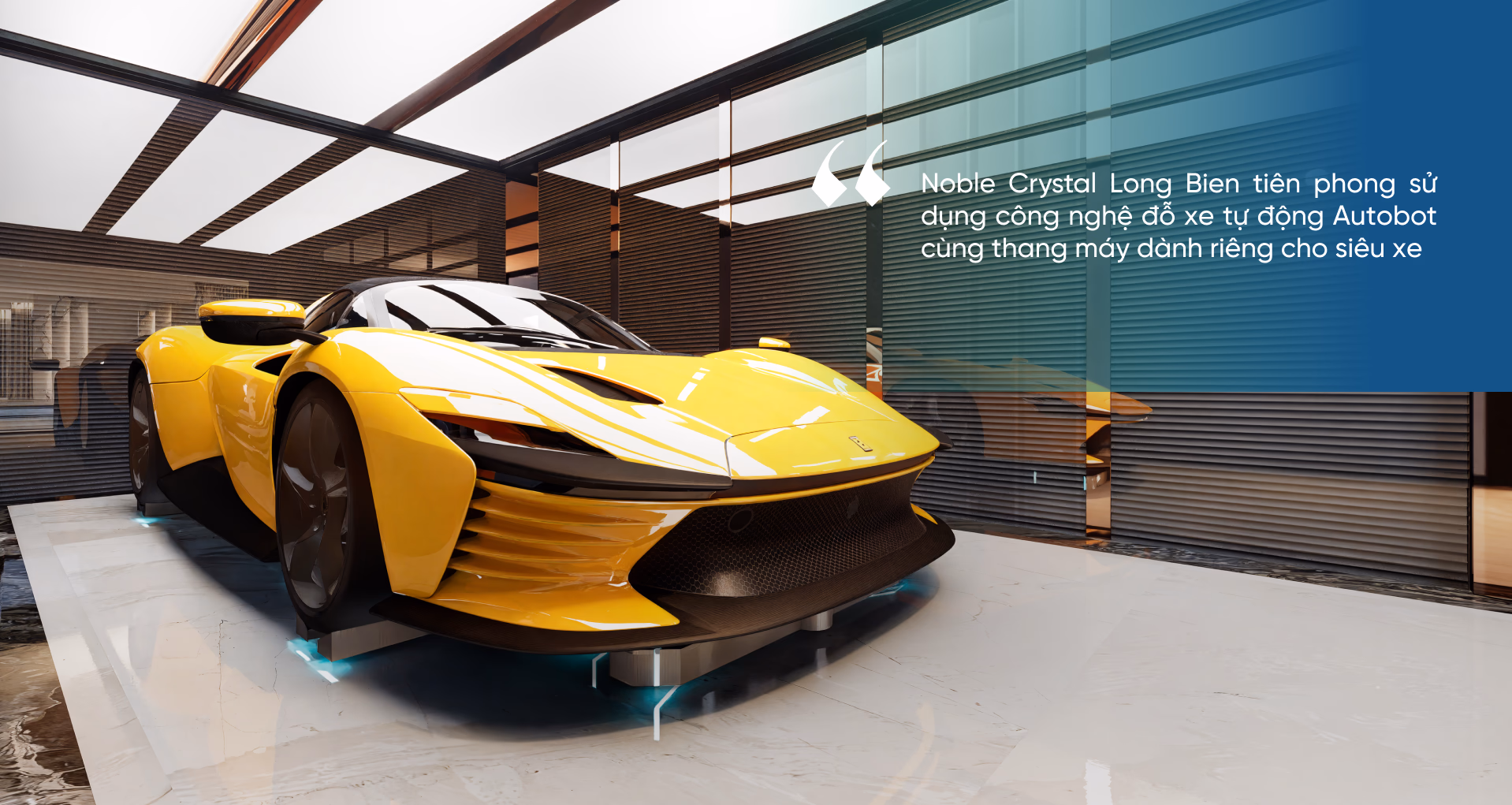 Hàng loạt giải pháp dịch vụ tiên phong dành cho siêu xe sẽ được áp dụng tại Noble Crystal Long Bien, bao gồm công nghệ đỗ xe tự động Autobot - một "trợ lý" đỗ xe thông minh ứng dụng công nghệ Robotic và AI lần đầu tiên xuất hiện tại Việt Nam; thang máy được thiết kế đặc thù theo tiêu chuẩn dành riêng cho các xe sang và siêu sang; khu vực để xe sang riêng biệt - một "Gallery" của các kiệt tác tốc độ với an ninh nghiêm ngặt, hệ thống nhiệt độ ổn định, cùng dịch vụ vệ sinh và chăm sóc xe định kỳ. Và đặc biệt là dịch vụ đỗ xe tại hầm, trả xe tại sảnh góp phần nâng tầm trải nghiệm tiện nghi, mang lại sự thuận tiện và thoải mái tột cùng cho các gia chủ thượng lưu.